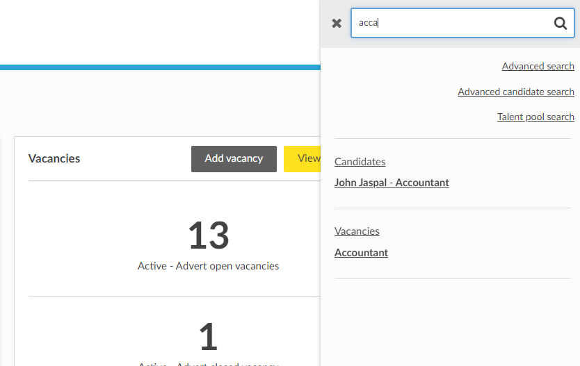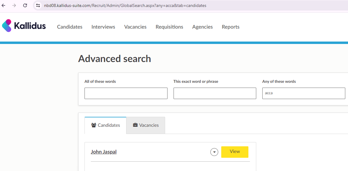 TIP: If the search term is something you search for regularly, you can bookmark your search in your browser, so you can run the search again at any time. In this example, the search is for the term 'acca' across candidates, so the URL which can be bookmarked is https://nbd08.kallidus-suite.com/Recruit/Admin/GlobalSearch.aspx?any=acca&tab=candidates
