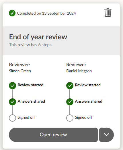 Note: Force closing a review will not 'Sign' it off. The review will close, but as either both or one of the participants have not signed this off, then the review will not show them as having done so.