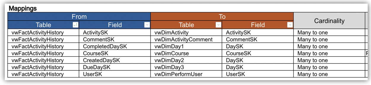 For guidance on the table relationships of each dataset, refer to respective dataset Mappings table in the resources linked below: