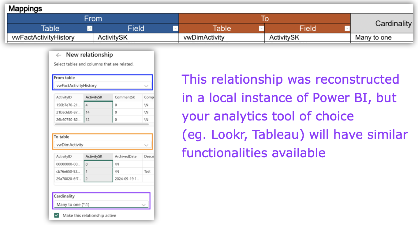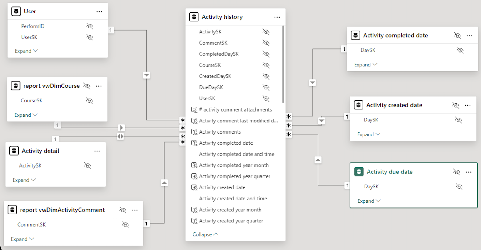 For example, you can see the Development Activities dataset below consists of a central "activity history" Fact table, surrounded by a set of Dimension tables that feed into it - forming a star-like shape: