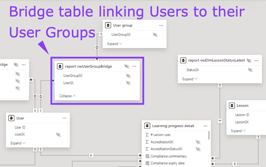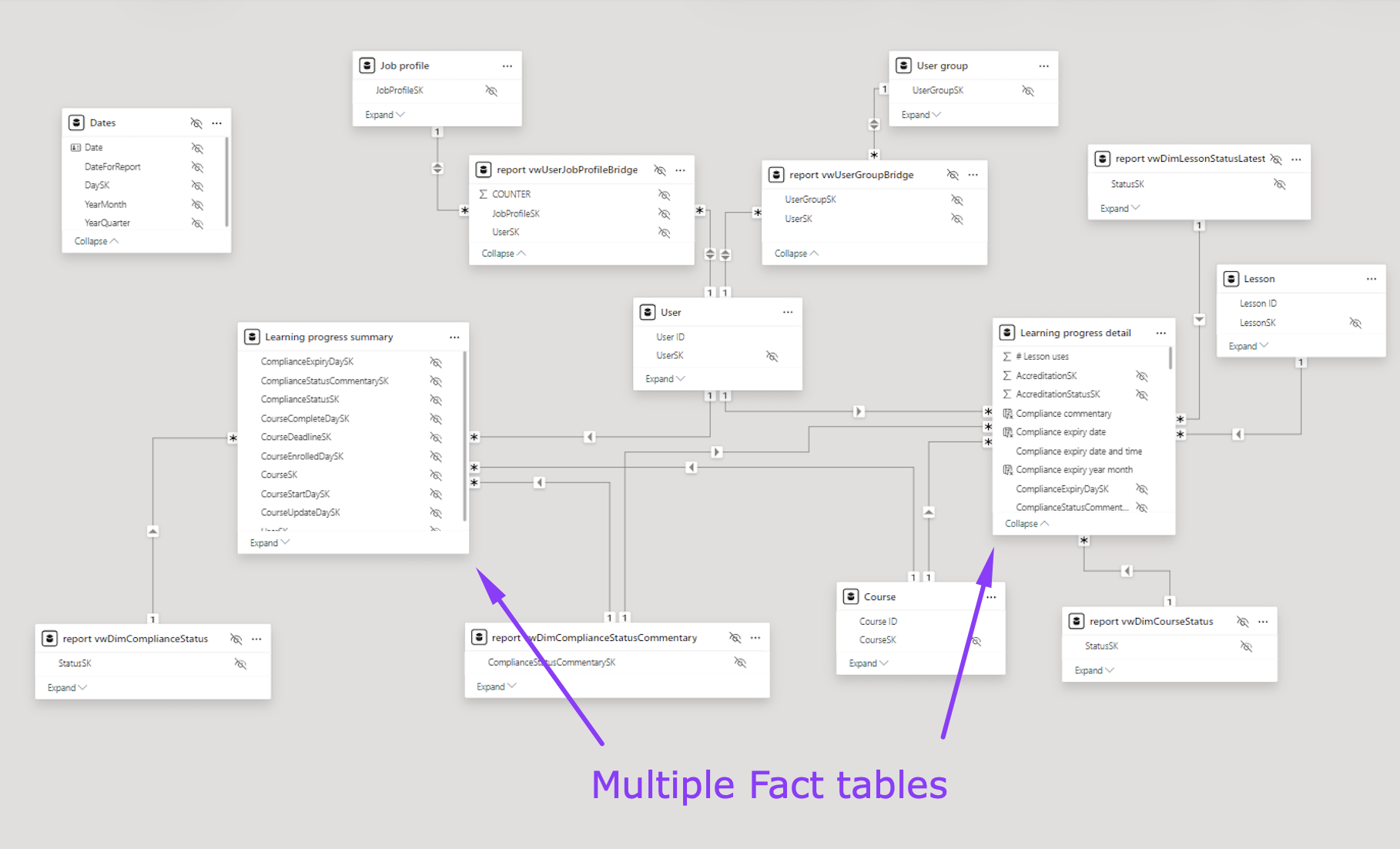 For example, you can see the Learning Progress dataset below contains multiple Fact and Bridge tables: