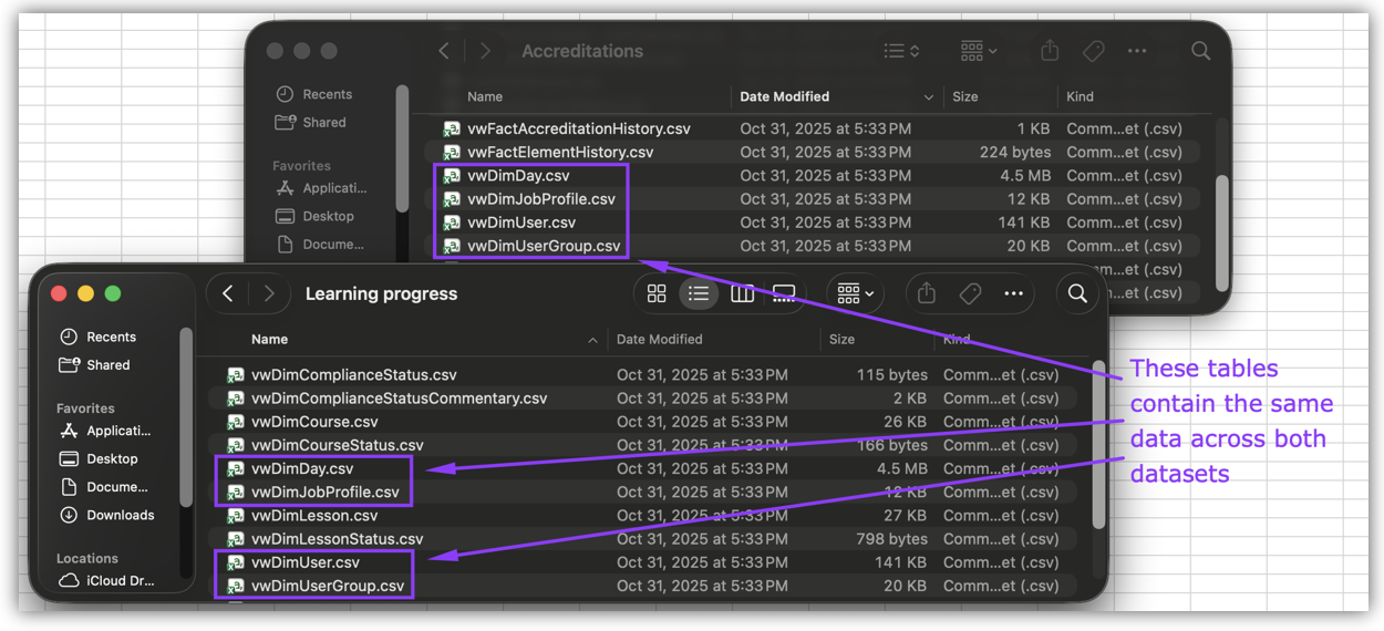 For example, you can see the Accreditation and Learning Progress datasets below share multiple common tables: