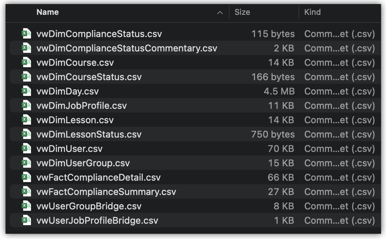 Once a dataset has been exported, it is simply a collection of unrelated CSV tables. To replicate the reporting capabilities of Kallidus Power BI, you need to reconstruct the relationships between the tables in your analytics tool of choice.