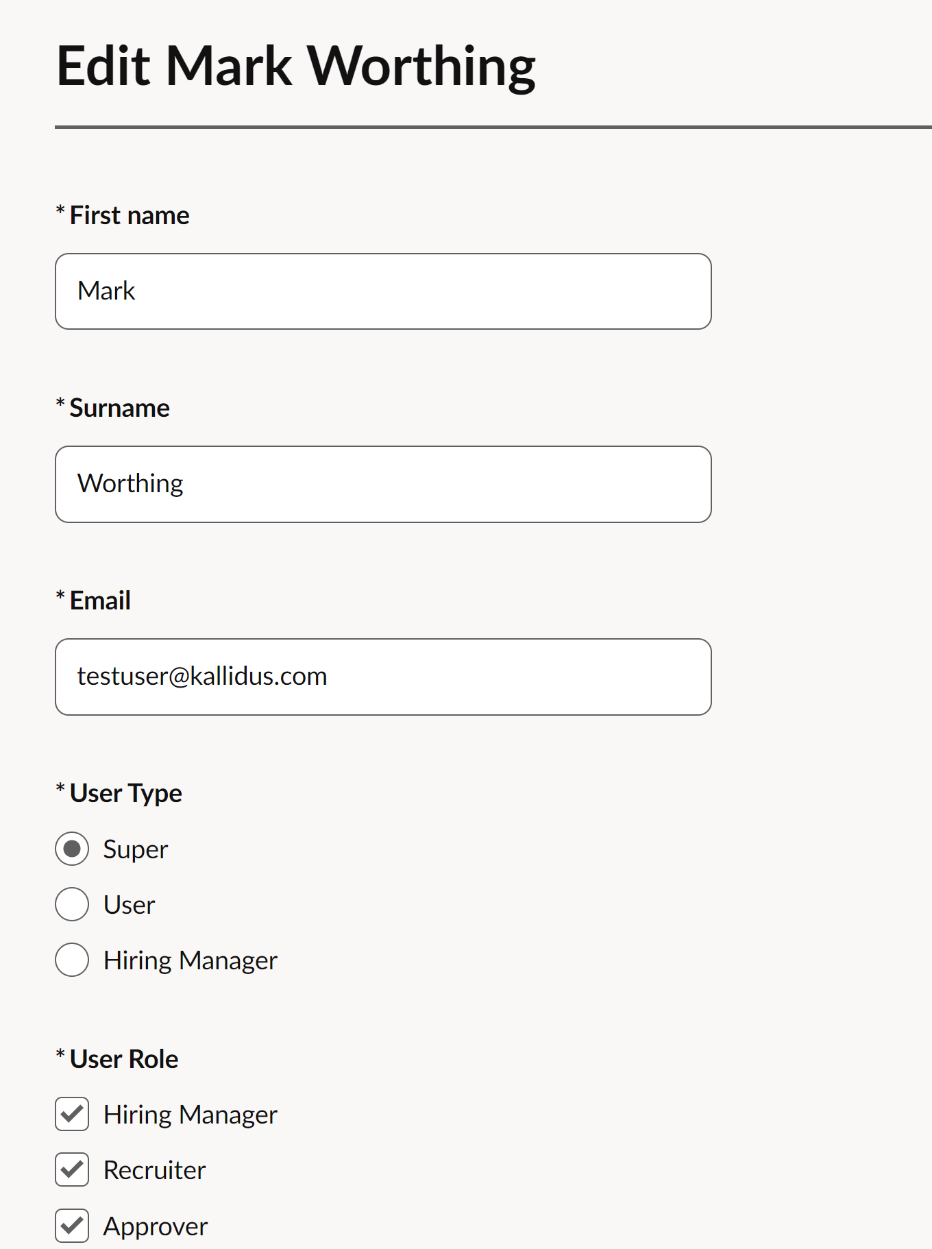 User Roles are used to manage vacancy ownership and requisition stage approval rights. Check as many as are necessary to authorise a user to complete relevant tasks. In the example above, we can see three available User Roles: