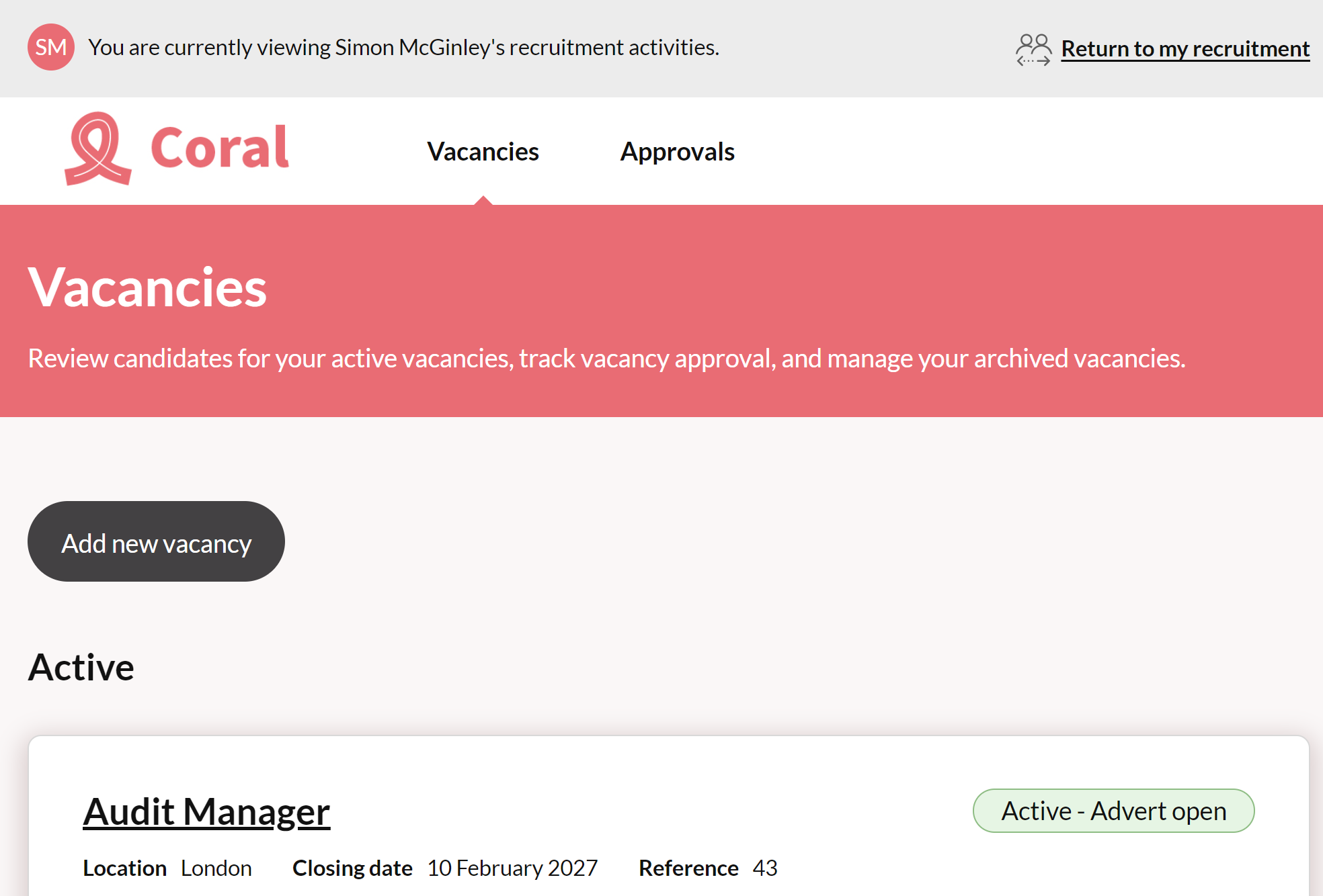 - Click 'Return to my recruitment' to go back to your own work.