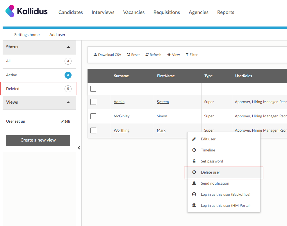 Users may be deleted by authorised Super users who are logged into the Recruit Admin portal (Backoffice). You require both access to the User list (which requires you to be user type: Super user) AND you need to be in a security group which allows access to the "Delete user" function (usually a security group called "Super users").