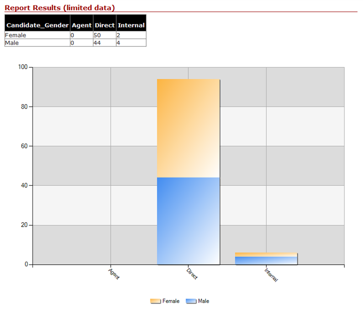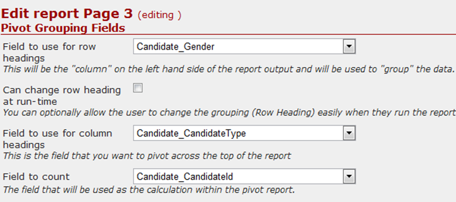 This page is used to define the two columns that are used for your pivot report. In the above example the report is set to show the type of candidate against the gender of the candidates. This results in the report below: