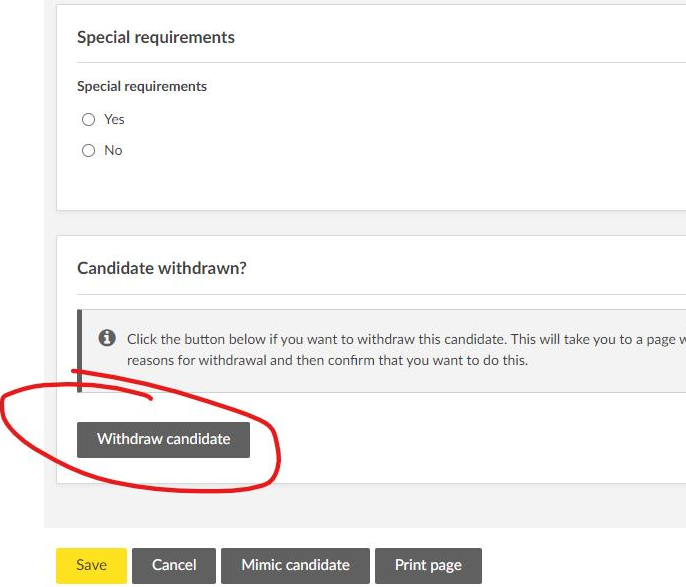 A: No. The candidate must click to withdraw, then confirm they want to go ahead with withdrawing their application.