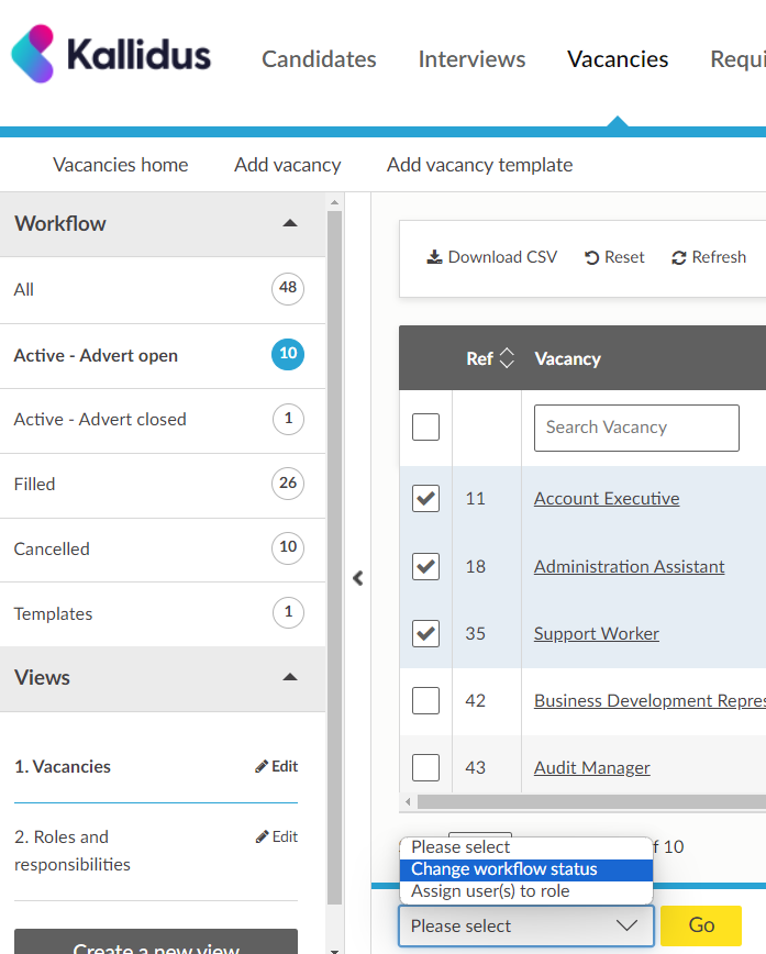 You can also change vacancy statuses in bulk by selecting multiple vacancies on the data grid and choosing 'Change status' in the bulk action dropdown list.