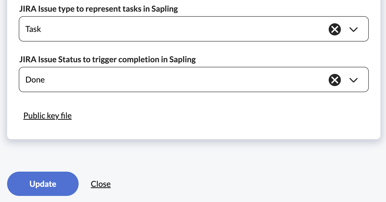 When tickets are completed in Jira, the corresponding task will immediately be completed in Sapling. For this to sync to work, the "completed" status of the Jira ticket has to match the completed status specified under the integration settings.