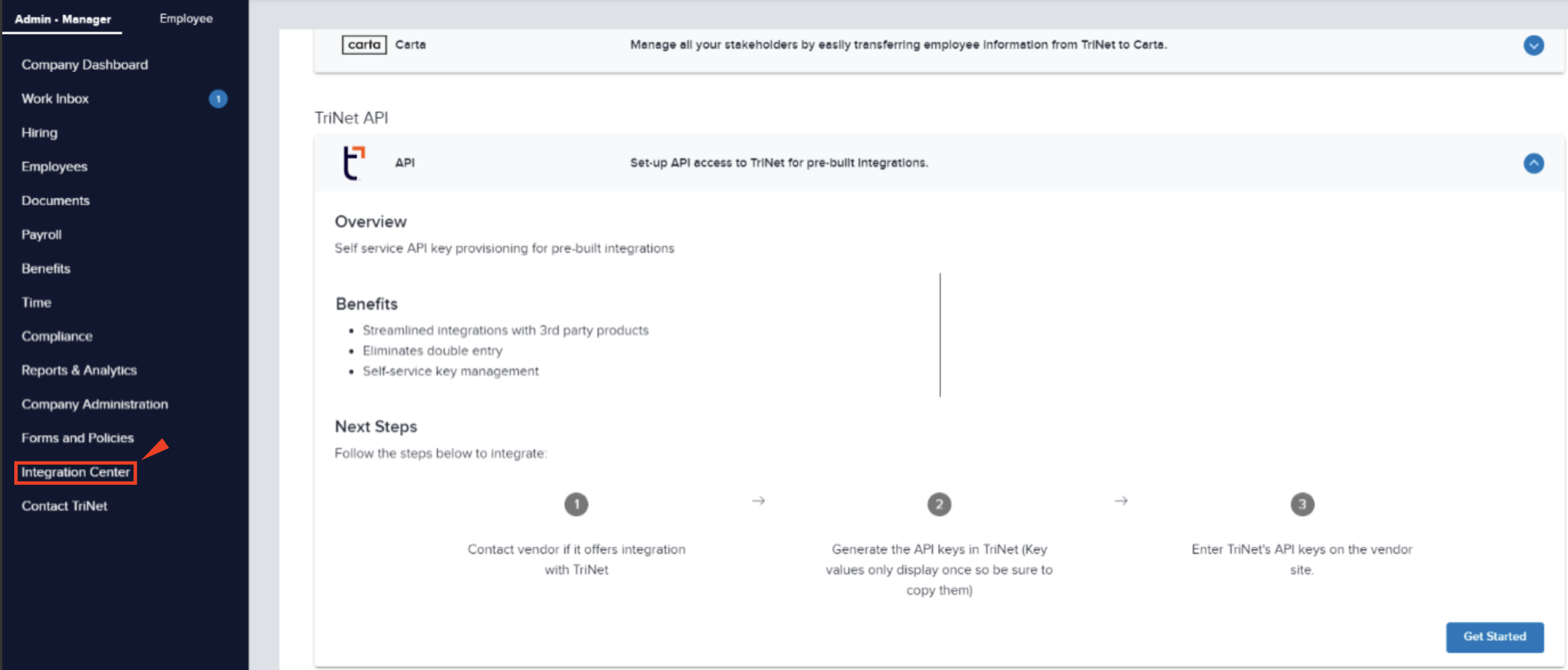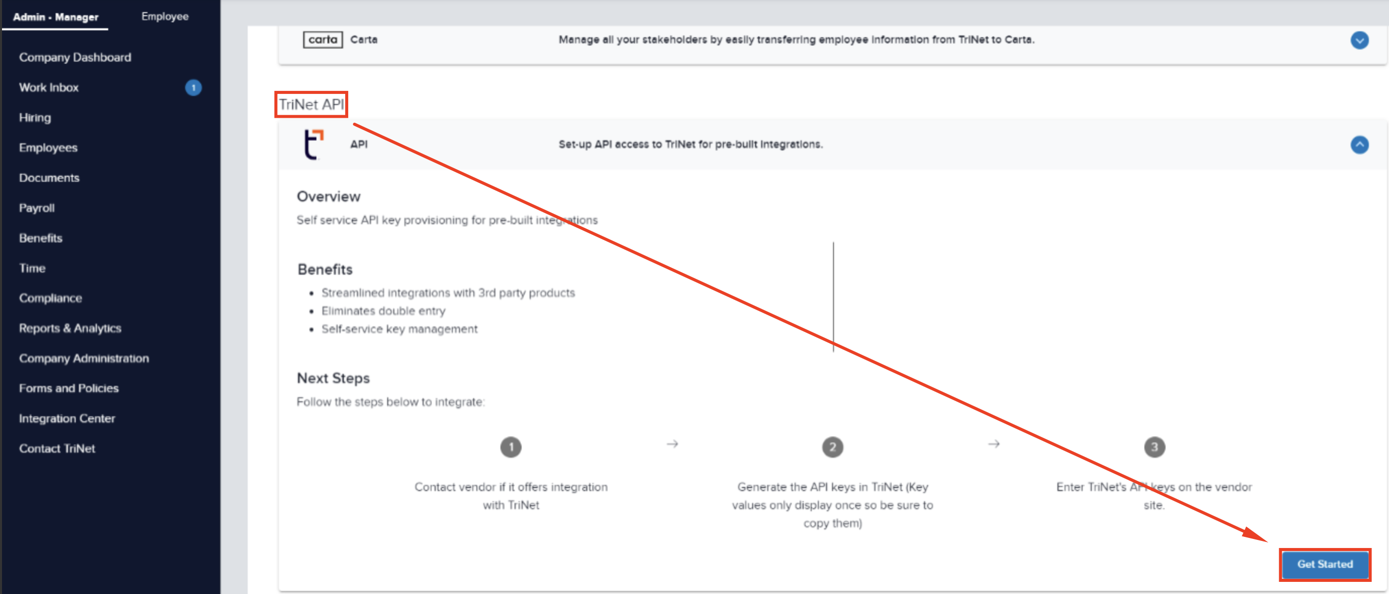 - Scroll down to find Trinet API and click "Get Started"