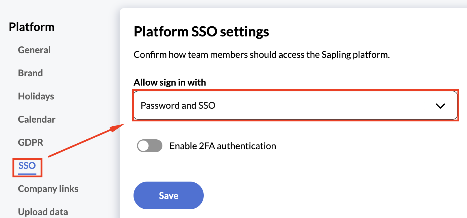 - Under the SSO tab, allow for users to sign in using "Password and SSO" or "SSO only" and click "Save"