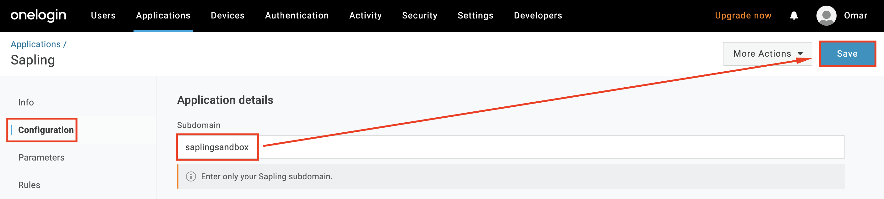 - Under Configuration, enter your Sapling subdomain and click "Save"