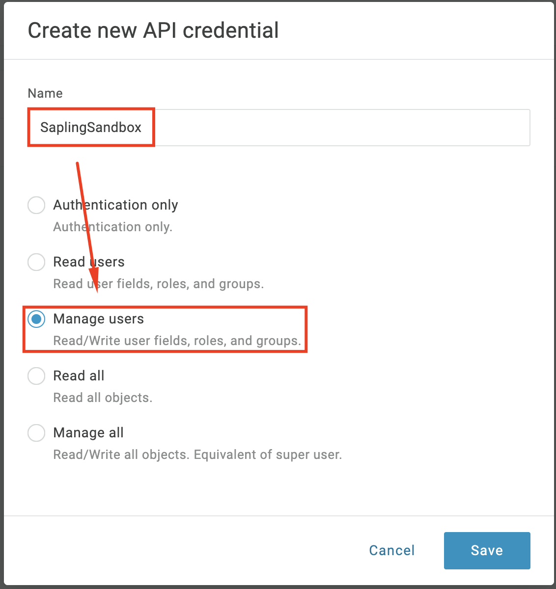 - Enter any descriptive name for your integration and select "Manage Users"