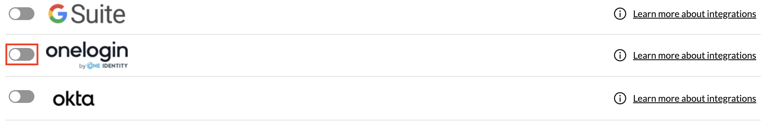 - Scroll down to find the OneLogin integration and enable the integration slider