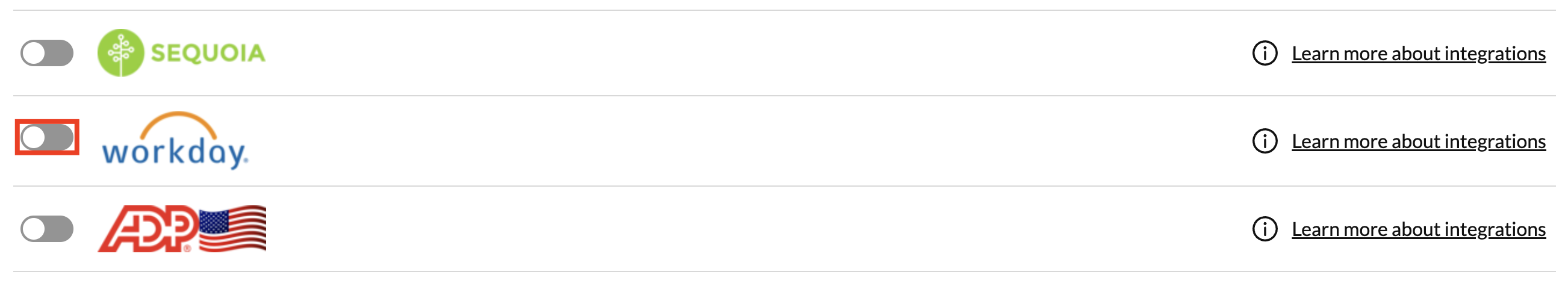 Under Administration Tools, navigate to Integrations and enable the Workday integration