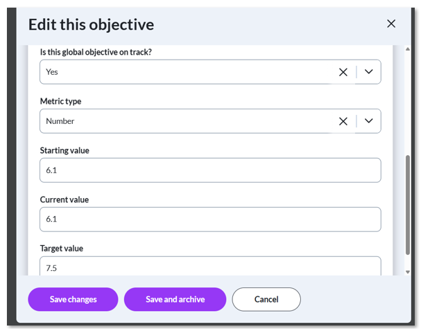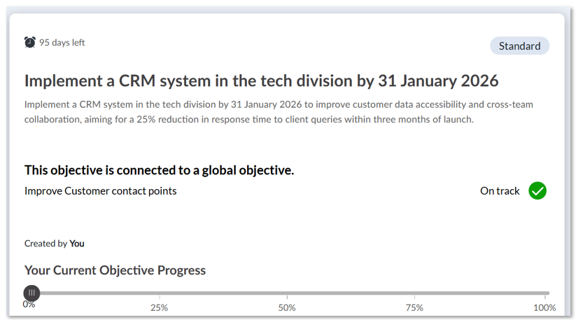 Within a global objective, you can now outline whether the objective is on track or off track and further outline the current state of play regarding the target: