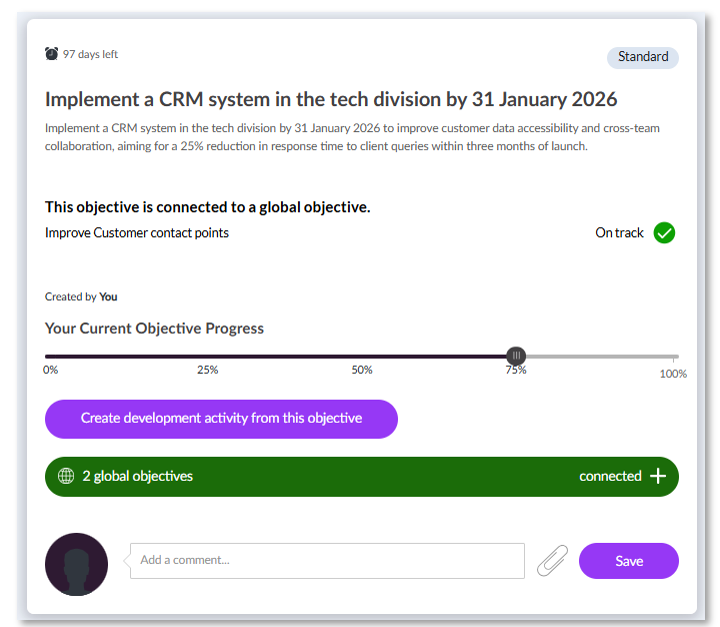 This ensures that within the system, it can be seen that this development activity is supporting a particular objective. In turn, if that objective is linked to a global objective, then we understand that this personal development is supporting that business goal.