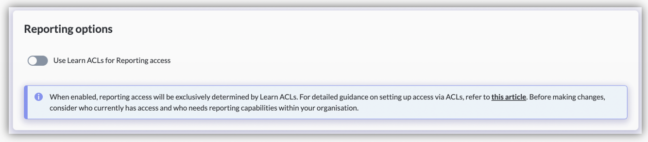 We've now added the ability to dynamically manage access to Power BI Reporting using LMS roles and ACL permissions. This new feature enables you to manage access in bulk without manually setting the Reporting permissions in Manage Users for each user.