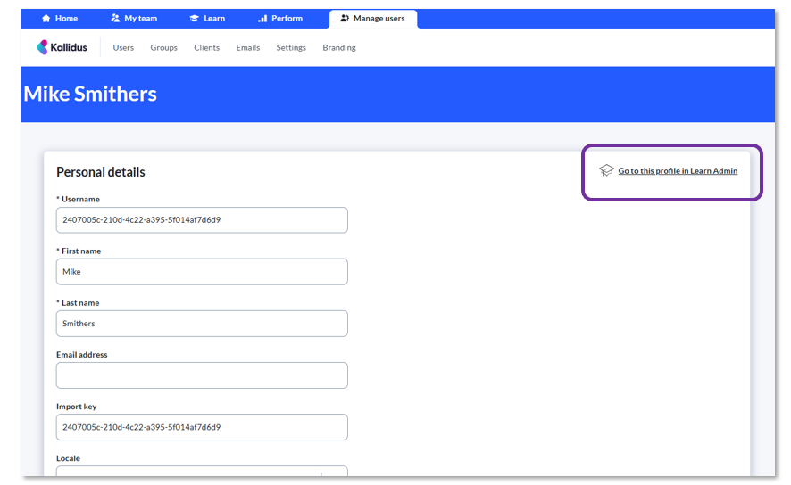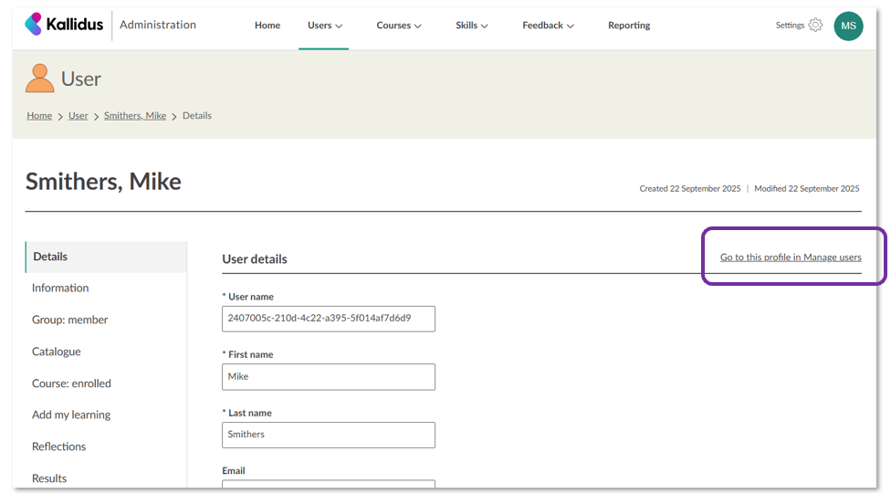 Previously, Manage Users included a link that allowed administrators to jump directly to a user’s profile in Learn: