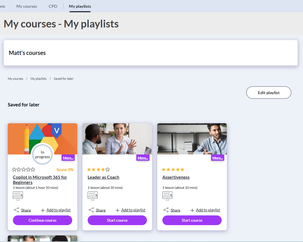 A playlist is a learner-driven feature that allows employees to curate content in a personalised way. Learners can create playlists to save content for later, keep frequently referenced resources in one place, or organise learning around skills they want to develop.