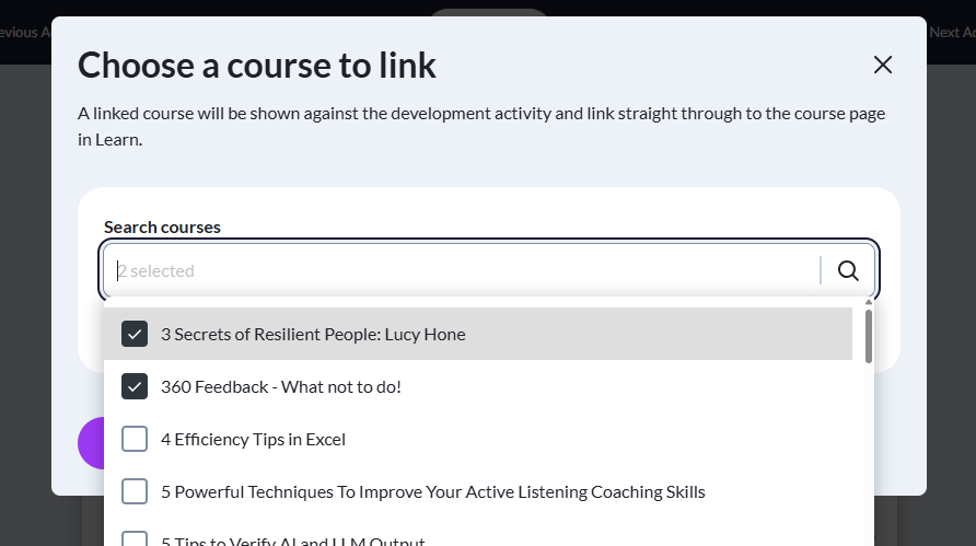 To better reflect real learning journeys, you can now attach multiple courses to a single development activity. This gives individuals and managers greater flexibility and ensures development plans capture the full range of learning needed to build the right skills.