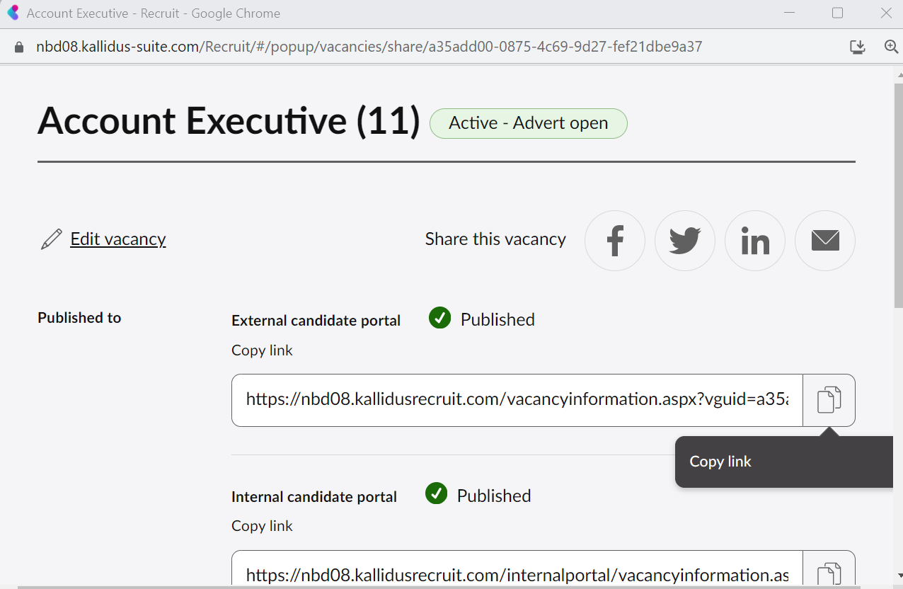 Each vacancy details page has its own unique link, which can be copied and pasted manually when advertising the role on a job board.