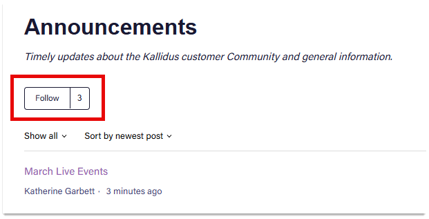 Use the follow button to receive notifications when new posts are made in a topic. We recommend following ‘Announcements’ to stay up to date on what's new.
